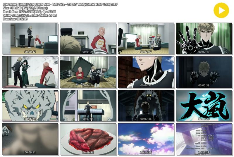 | [Judas] One Punch Man - S02 OVA - 01 [BD 1080p][HEVC x265 10bit].mkv | 162.6 M | MKV | - | 1920x1080 |