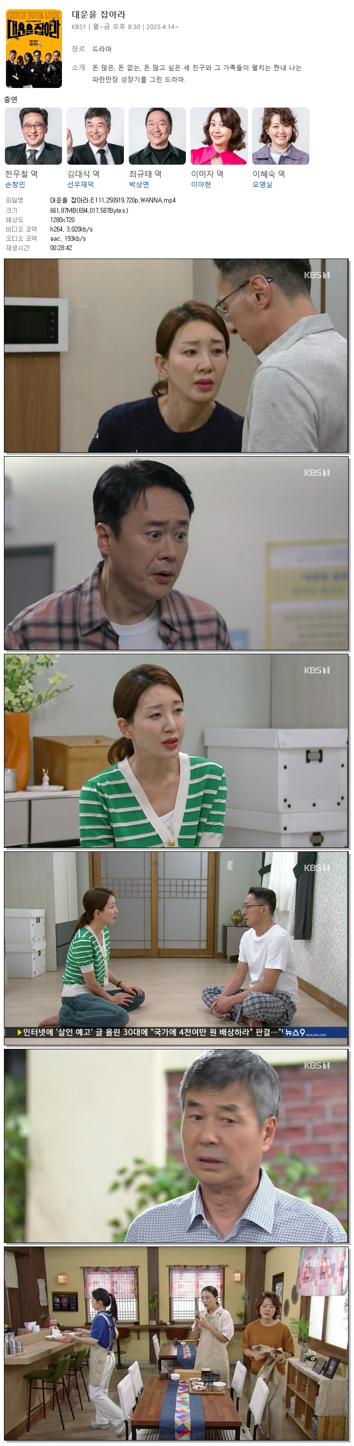 [KBS1] 대운을 잡아라.E111.250919.720p.WANNA[손창민, 이아현]
