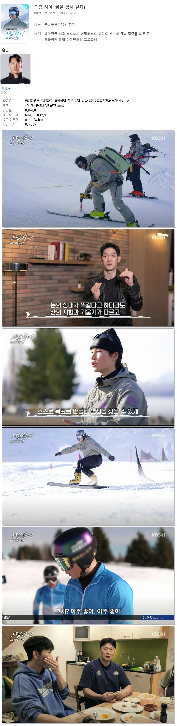 [KBS1] 동계올림픽 특집다큐 드림하이 꿈을 향해 날다.E01.260207.450p.WANNA[이상호]