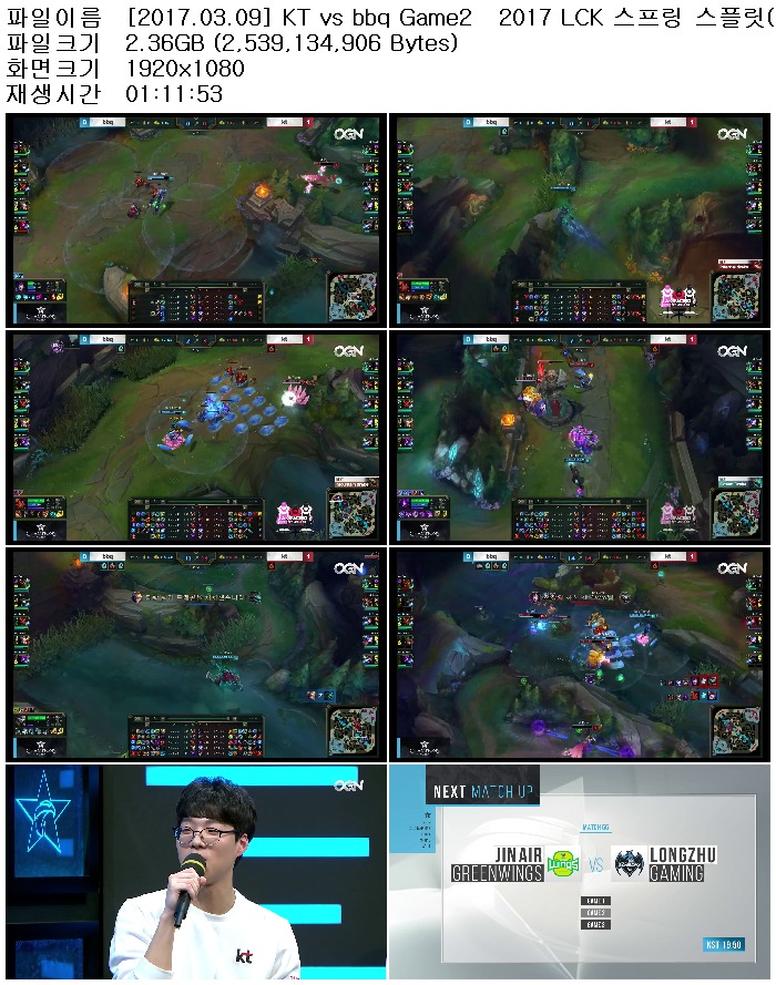 [2017.03.09] KT vs bbq Game2 2017 LCK 스프링 스플릿(롤챔스).mp4 2.4 G MP4 01:11:53 1920x1080