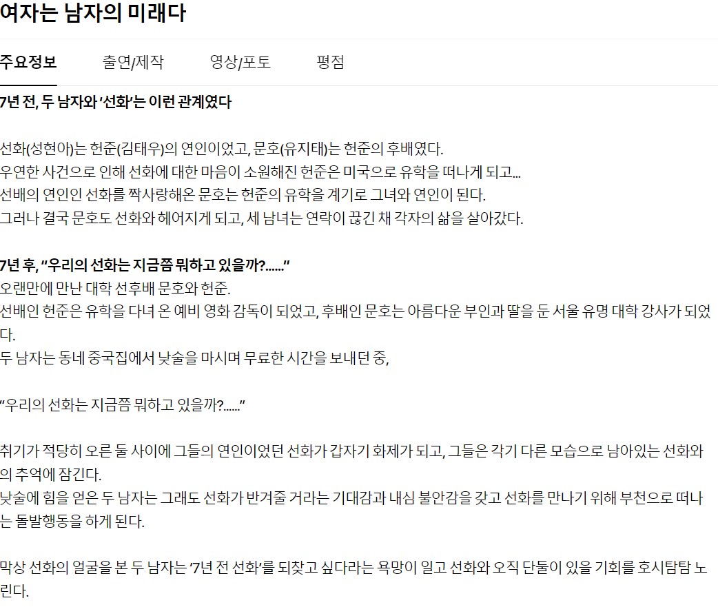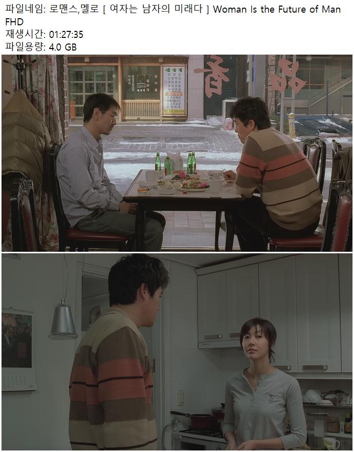 | 로맨스,멜로 [ 여자는 남자의 미래다 ] Woman Is the Future of Man FHD.mp4 | 4 G | 01:27:35 | 1920x1080 |