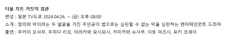 | 더블 치트 거짓의 경관 시즌1 3화.mkv | 1.6 G | 00:45:14 | 1920x1080 |