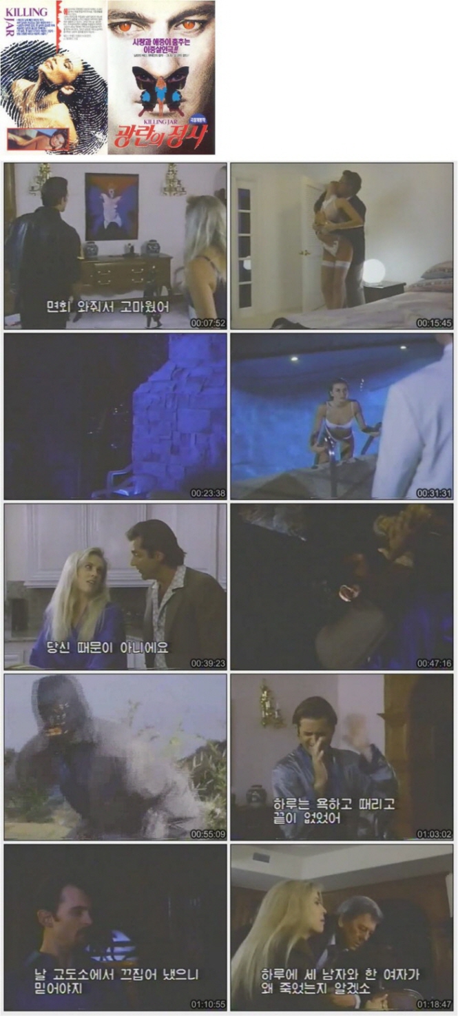 | 광란의 정사 (The Killing Jar) 감독: 데이비드 블룸 주연: 제임스 반 패튼, 파멜라 진 브라이언 한때 성인영화를 주름잡았던 여배우 로린. 지금은 재벌이자 유명한 변호사의 아내가 되어있다. 희귀곤충 수집광으로 이름난 남편은 여유로운 생활 속에서도 항상 새로운 파트너를 찾으며 마음껏 관계를 즐기려 한다. 아내인 로린 몰래 그녀의 여자 친구와 밀회를 즐기고 있었던 것이다. 이 사실을 안 로린은 절망에 빠지지만 어쩔 수 없었다. 그때 자신의 옛날 애인이 접근해 오지만 로린은 완강히 그를 거부한다. 며칠 후 경비원 사내가 로린을 죽이려고 침입을 한다. 그러나 죽음일보 직전의 한 순간에 옛 애인이 나타나 침입자를 죽이고 로린은 목숨을 건지게 된다. 그러나 남편은 이 옛 애인에게 로린을 없애 달라는 부탁을 하면서 일은 한층 더 복잡해지는데. |