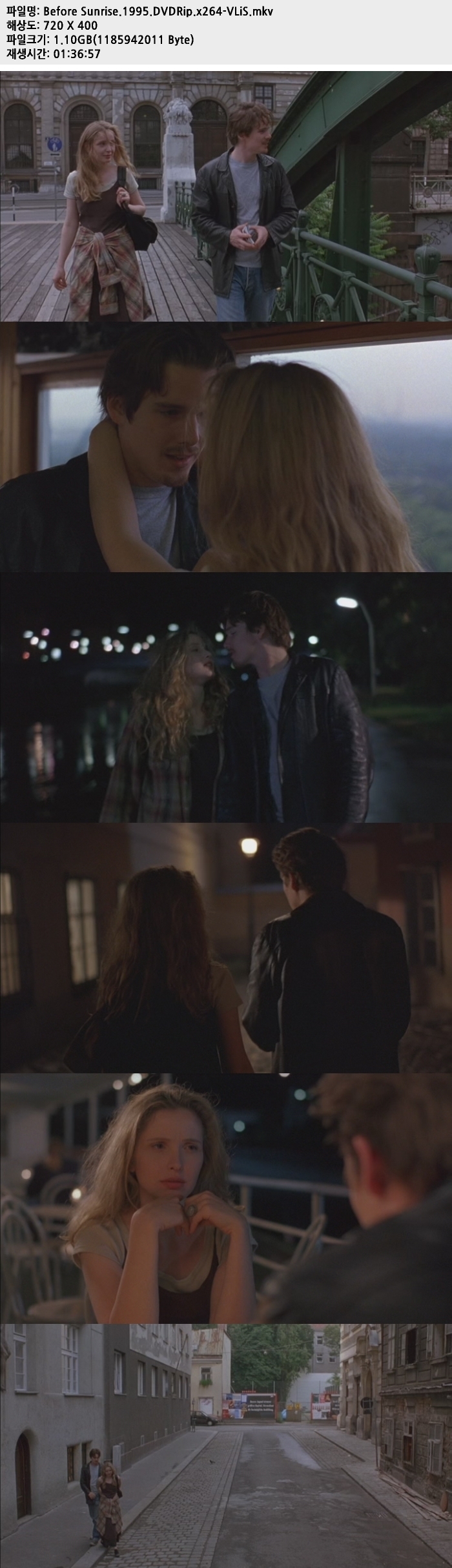 | Before Sunrise.1995.DVDRip.x264-VLiS.mkv | 1.1 G | 01:36:00 | 1296X720 |
