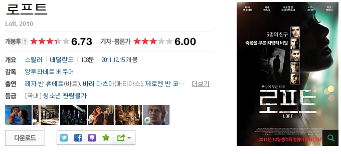 | Loft.2011.KORSUB.720p.HDRip.XViD.AC3-TMG.avi | 3.4 G | 01:51:00 | 1280x720 |