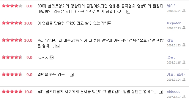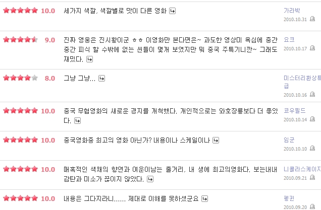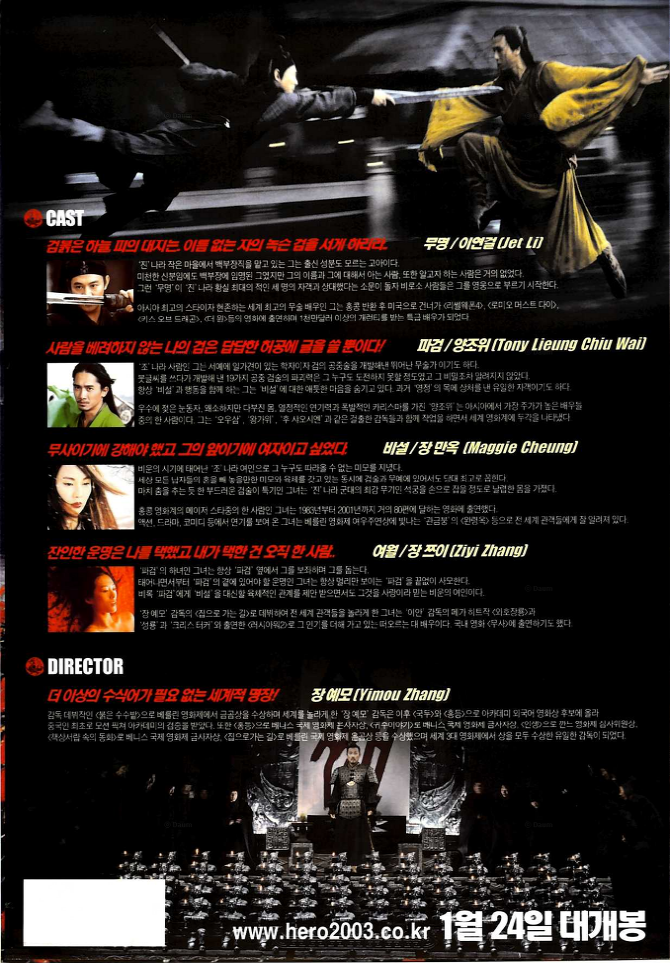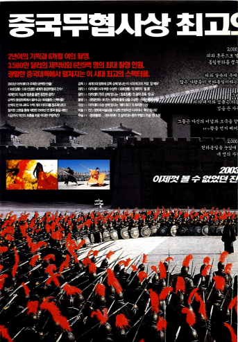 중국 전국시대를 배경으로 천하통일을 눈 앞에 둔 영정(진시황)을 암살하려는 무술 고수들에 얽힌 이야기. 칸느와 베니스를 석권했던 장예모 감독이 처음으로 무협물을 연출하고 있으며, 이연걸과 장만옥, 양조위, 장지이 등 화려한 출연진을 갖췄다. 영화는 이연걸과 견자단이라는 당대의 무술 배우가 펼치는 2인 검술 대결 장면이 화려한 비주얼로 선보이는 반면, 스토리는 단조로운 구조를 가졌는데, <와호장룡>의 제작사인 홍콩의 안락영편공사(安樂影片)가 세계 시장을 목표로 1억 위안(인민폐, 한화 160억 원)의 제작비를 조달하였다고 하며, 2년 여의 기획과 6개월여의 촬영, 3,500만 달러의 제작비와 6,500명의 최대 촬영 인원 등의 기록을 가진 대작이다. 무술을 익힌 전문 배우 이연걸과 견자단이 펼치는 검술 대결 장면과 하늘을 뒤덮는 화살 발사 장면이 가장 큰 볼거리이자 하이라이트. 2003년 제75회 아카데미 외국어영화상 노미네이트. 2003년초 설 연휴를 통해 국내 개봉되었는데, 당시 무려 191만명의 관객이 들면서 역대 국내 개봉된 홍콩/중국 영화 사상 최고 기록을 수립했다.