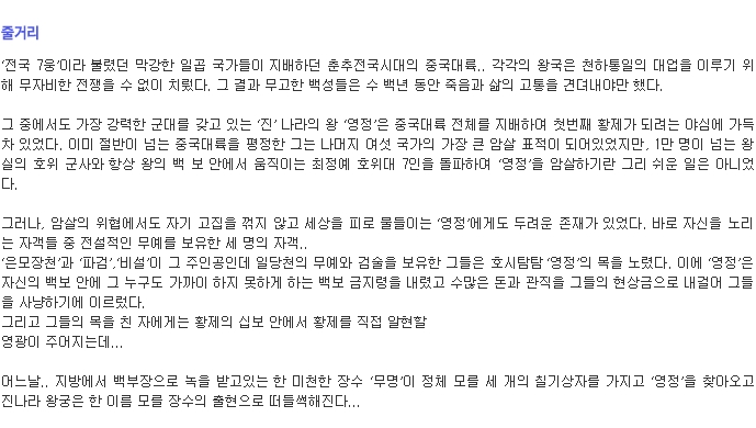 줄거리 : 진시황이 통일천하를 꿈꾸던 2000년 전... 그들이 있었다. 장예모 무협대작