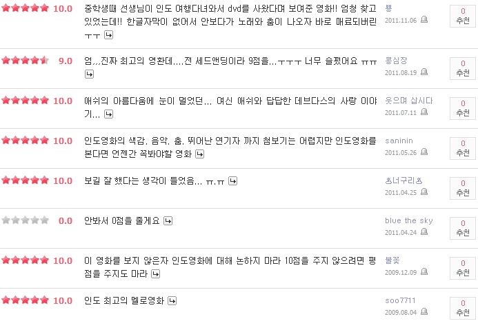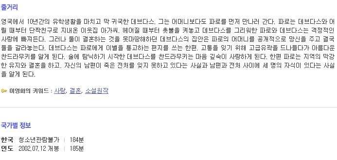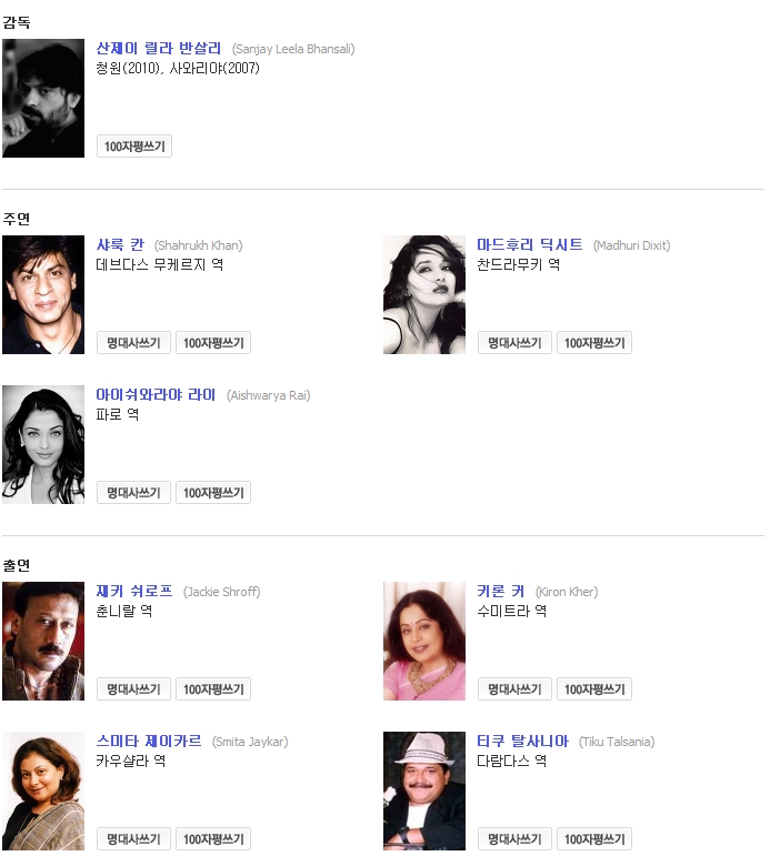 줄거리 : 1928년 이후 여러차례 영화화 된 사랏찬드라 샤테지(Saratchandra Chatterjee)의 동명 원작소설을 영화화하는 작품으로, 볼리우드(인도의 헐리우드를 일컷는 말) 역사상 최대의 제작비(1,030만 달러)가 투입된 작품이다. 자국내 영화상인 필름페어영화상(2002년)에서 16개 부문에 후보로 올라 작품, 감독, 남-녀 주연배우상 등 주요 부문을 포함 10개 부문을 석권했다. 2002년 칸영화제 비공식부문 출품, 이는 볼리우드 영화 최초의 칸 영화제 출품이다. 애쉬와리야 라이는 깐느영화제에서 심사위원으로 활동하기도 한 유명 배우.