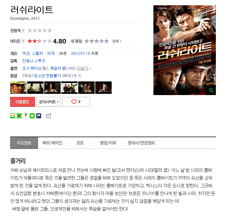 | 러쉬라이트.2012.KOR.HDRip.H264.mkv | 3.1 G | 01:36:26 | 1280X720 |