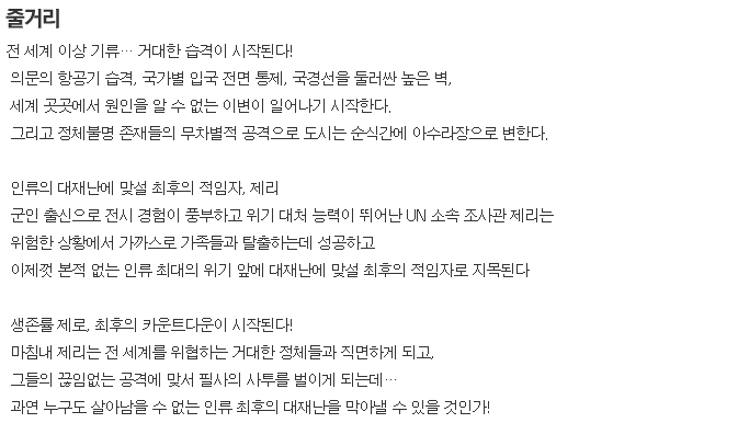 | World War Z 2013 Unrated Cut 720p BRRip x264 AC3-JYK.mkv | 2.7 G | 02:03:00 | 1280x720 |