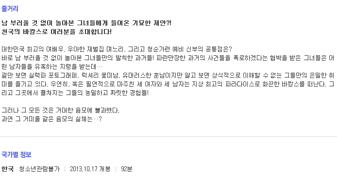 | Vacance.2013.450p.KOR.HDRip.XviD.avi | 1.5 G | 01:32:00 | 800x450 |