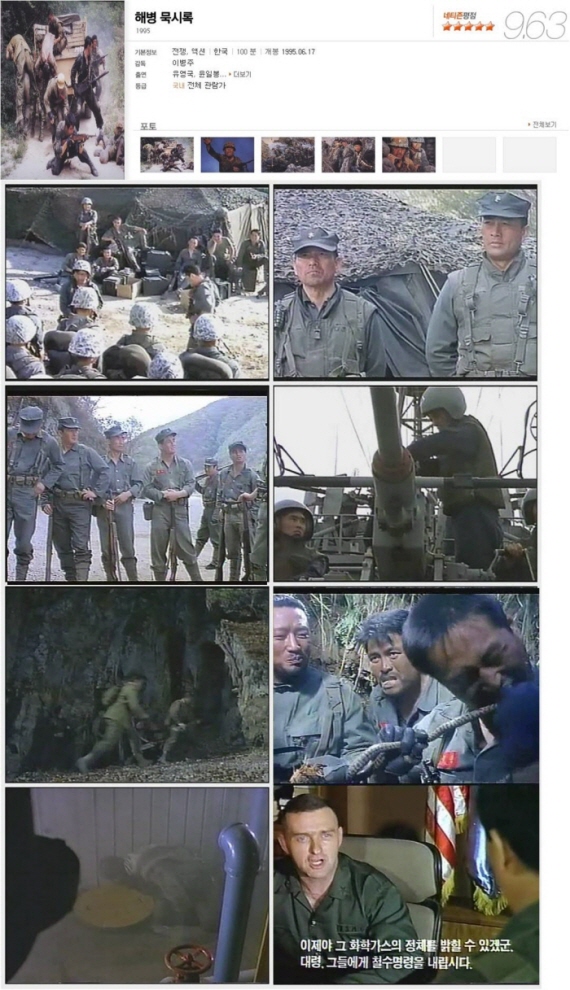 | 해병묵시록 감독: 이병주 주연: 유영국, 윤일봉 6.25 한국전쟁이 막바지로 치닫던 1952년. 한쪽에서는 휴전회담이 한창 진행되고 있을 무렵, 미 정보국은 북한이 화학전을 준비하고 있음을 공중정찰을 통해 알아낸다. 몇 번의 특공대를 투입 하였지만 실패한 미국은 이 작전 수행의 적임으로 한국의 해병 1중대의 대원들을 지목하고 그들에게 특수 훈련을 시켜 적지로 잠입시킨다. 북한 깊숙이 투입된 해병대원들은 산속에서 반 공산 투쟁을 하고 있는 유격대의 해방구를 찾게되고, 그들로부터 자유의 소중함을 새삼 깨닫는다. 유격대의 도움으로 적의 검덕산 화학연구소에 침투한 대원들은 그곳이 인체 화학실험을 하는 곳이란 것을 알아내고 폭파해 버린다. 철수하는 특공대원들 앞에 인민군 최정예 수색대들이 나타나 이들의 퇴로를 차단 시키는데. |
