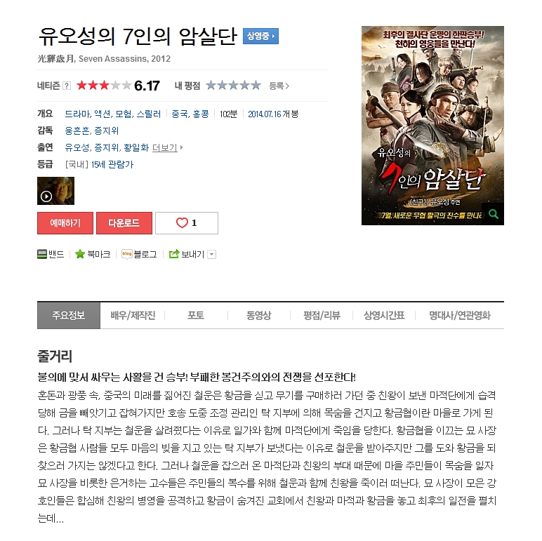 | 유오성의 7인의 암살단.자체자막.2014.720p.HDRip.Divx.avi | 3 G | 01:42:00 | 1280x720 |