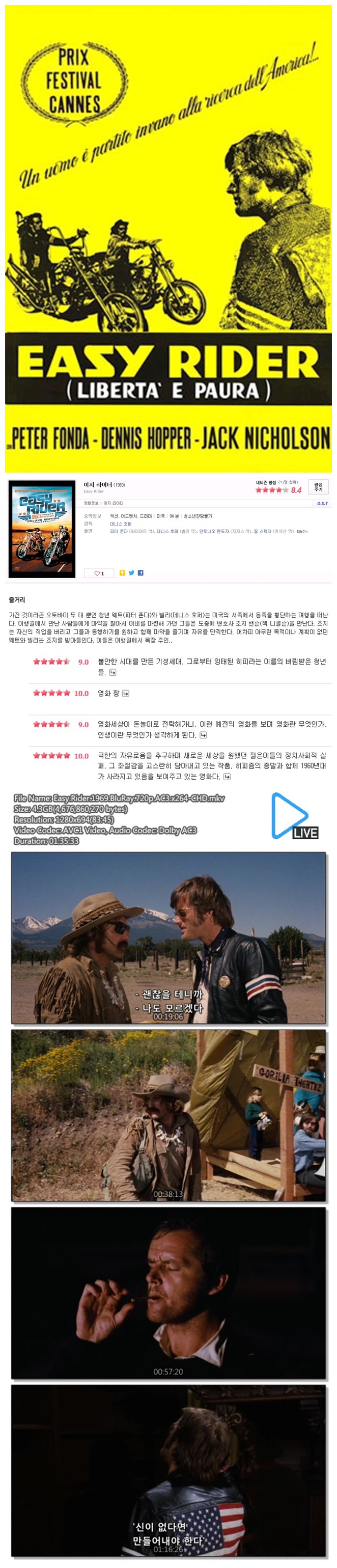 | Easy.Rider.1969.BluRay.720p.AC3.x264-CHD.mkv | 4.4 G | 01:35:00 | 1280x720 |