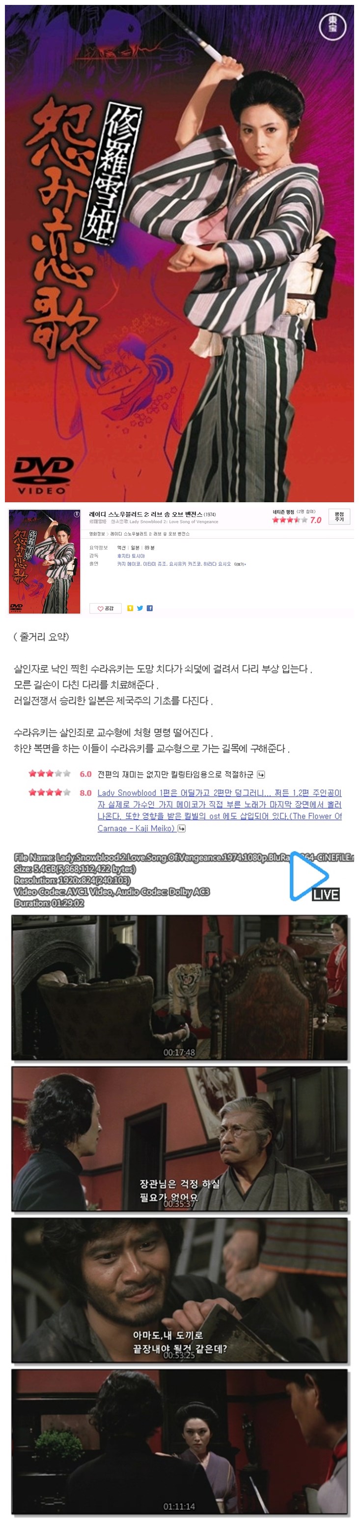 | Lady.Snowblood.2.Love.Song.Of.Vengeance.1974.1080p.BluRay.x264-CiNEFiLE.mkv | 5.5 G | 01:29:00 | 1920x1080 |