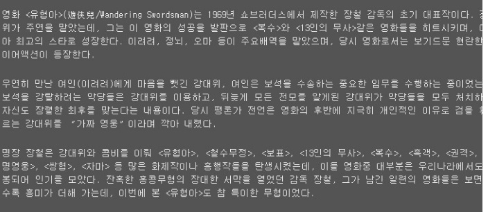 | 유협아.Wandering.Swordsman.1970.DVDRip.XviD-ESPiSE.avi | 699.3 M | 01:43:00 | 800X336 |