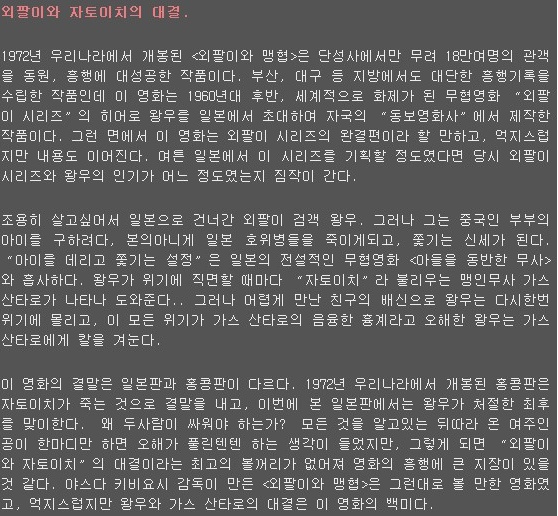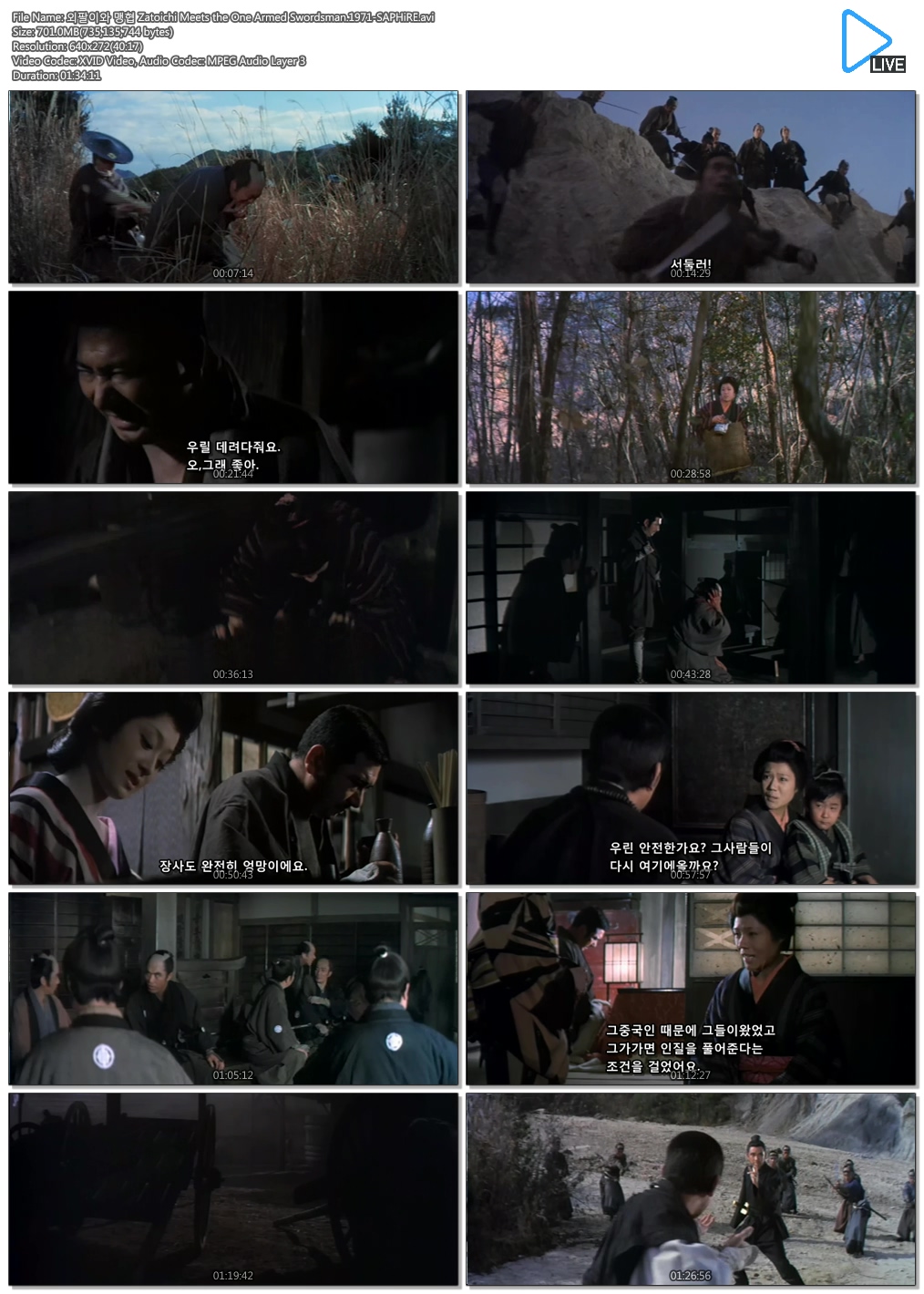 | 외팔이와 맹협 Zatoichi Meets the One Armed Swordsman.1971-SAPHiRE.avi | 701.1 M | 01:34:00 | 800X339 |
