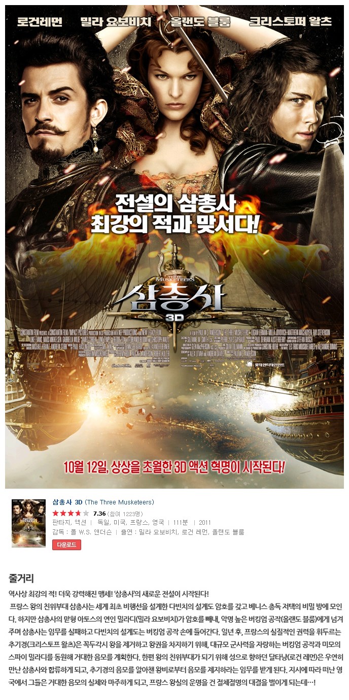 삼총사 3D 2011 (올랜도 블룸, 밀라 요보비치)