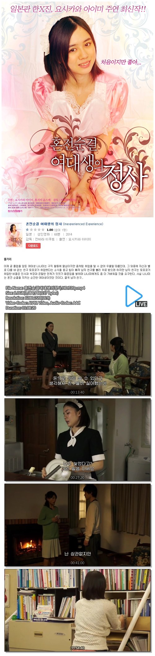 | 혼전순결여대생의정사.HD.720p.mp4 | 1 G | 01:08:20 | 1280x720 |