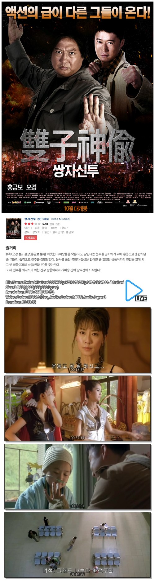 | Twins.Mission.2007.720p.KOR.VODRip.WMV9.WMA-iMrel.avi | 3.8 G | 01:33:00 | 1280x720 |