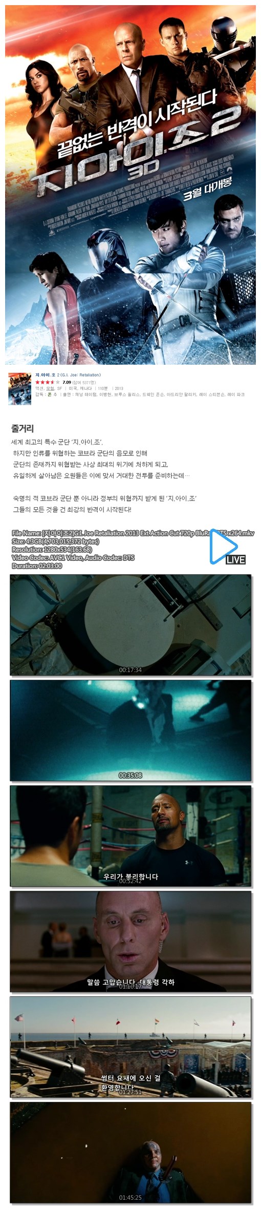 | [지아이조2]G.I. Joe Retaliation 2013 Ext Action Cut 720p BluRay DTS x264.mkv | 4.4 G | 02:03:00 | 1280x720 |