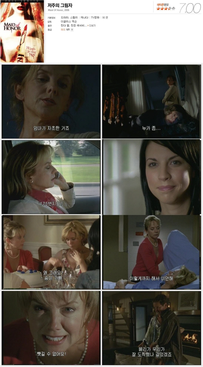 | 메이드 : 저주의 그림자(Maid of Honor) 감독 더글라스 잭슨 출연 린다 펄 린든 애쉬비 섀논 스터지스 대니얼 킨드 사장인 리차드 윈은 2년 전 교통사고로 사랑하는 아내를 잃고 딸 몰리, 아들 대니 그리고 처형인 레이시와 살아간다. 리차드는 연인인 니콜과의 만남을 결혼으로 이어가려 하는데 집안 살림을 맡아하던 레이시는 리차드에게 연정을 품고 니콜과의 결혼을 막으려 한다. 레이시는 아이들에게 니콜에 대한 험담을 하고 또한 니콜의 집에 몰래 들어가 그녀의 과거를 캐려 하는데... 레이시는 살인죄로 복역 중인 니콜의 전남편의 일을 알아내고 리차드와 가족에게 알리지만 이마저 가족들이사랑으로 감싸려하자 땅콩 알러지가 있는 니콜에게 땅콩이 든 케잌을 먹여 심장병을 일으키게 하지만 다행히 병원으로 후송돼 목숨을 건진다. 결국 몰리가 이모인 레이시의 행동을 수상히 여겨 아빠 리차드에게 알리자 레이시는 도망을 가고 그 후 바다에서 그녀의 핸드백이 발견되면서 그녀가 자살한 것으로 믿게 되는데... |