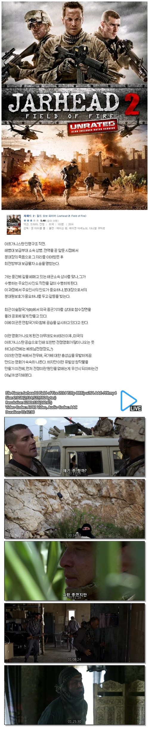 | Jarhead 2 Field of Fire 2014 720p BRRip x264 AAC-JYK.mp4 | 2.3 G | 01:42:00 | 1280x720 |