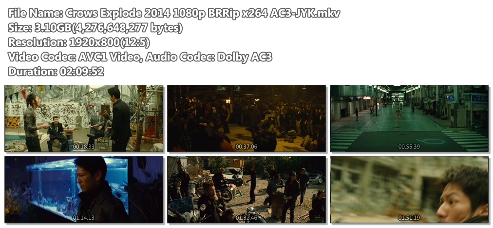 | Crows Explode 2014 1080p BRRip x264 AC3-JYK.mkv | 4 G | 02:09:00 | 1920x1080 |