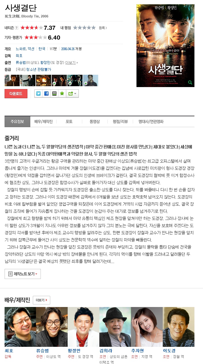 | 사생결단.Bloody.Tie.2006.DVDRip.XviD.mkv | 4.1 G | 01:56:46 | 800X340 |