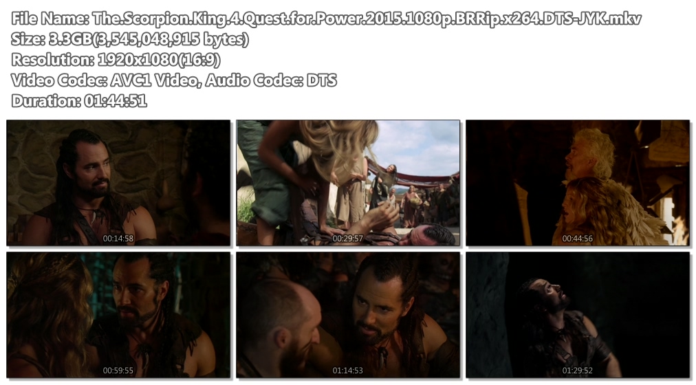 | The.Scorpion.King.4.Quest.for.Power.2015.1080p.BRRip.x264.DTS-JYK.mkv | 3.3 G | 01:44:00 | 1920x1080 |