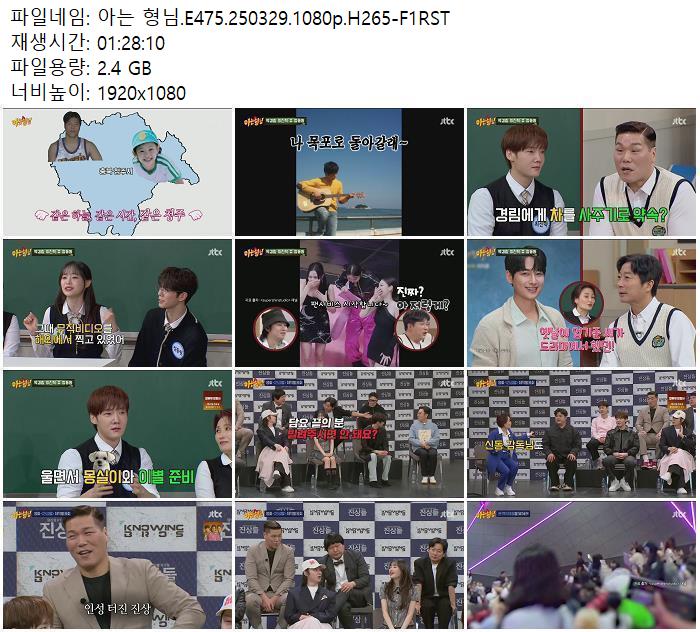 | 아는 형님.E475.250329.1080p.H265-F1RST.mp4 | 2.4 G | 01:28:00 | 1920x1080 |