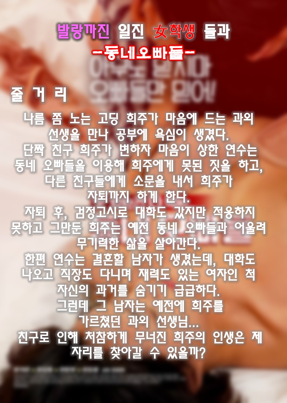 본 정보내용은 청소년유해매체물로서 정보통신망이용촉진 및 정보보호 등에 관한 법률 및 청소년보호법의 규정에 의하여 만 19세 미만의 청소년이 이용할 수 없습니다. 아동·청소년 음란물(야동,포르노)을 제작·배포·소지한 자는 형사 처벌을 받을 수 있습니다.
