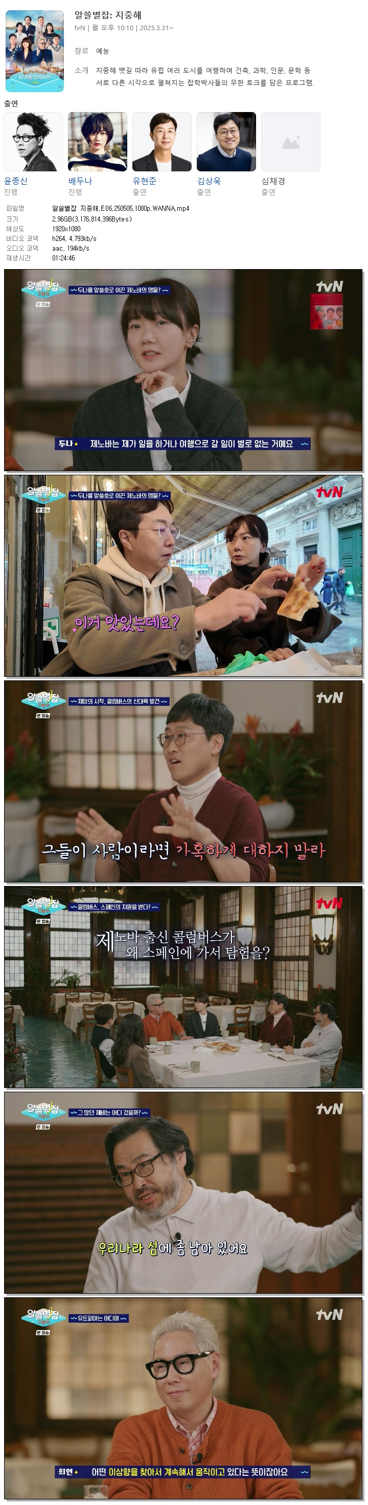 [TVN] 알쓸별잡 지중해.E06.250505.1080p.WANNA[윤종신, 배두나].mp4 3 G 01:24:46 1920x1080