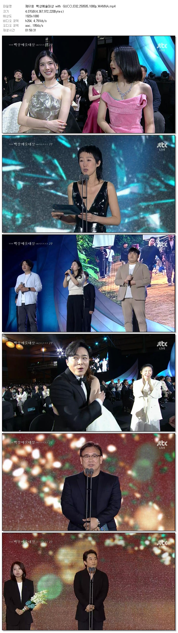 | [JTBC] 제61회 백상예술대상 with GUCCI.E02.250505.1080p.WANNA[수지].mp4 | 4.1 G | 01:56:31 | 1920x1080 |