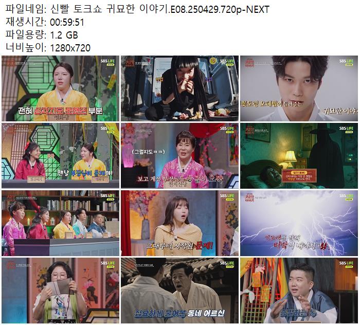 | 신빨 토크쇼 귀묘한 이야기.E08.250429.720p-NEXT.mp4 | 1.2 G | 00:59:51 | 1280x720 |