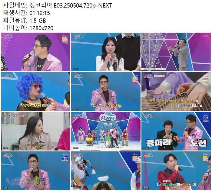 | 싱코리아.E03.250504.720p-NEXT.mp4 | 1.5 G | 01:12:00 | 1280x720 |