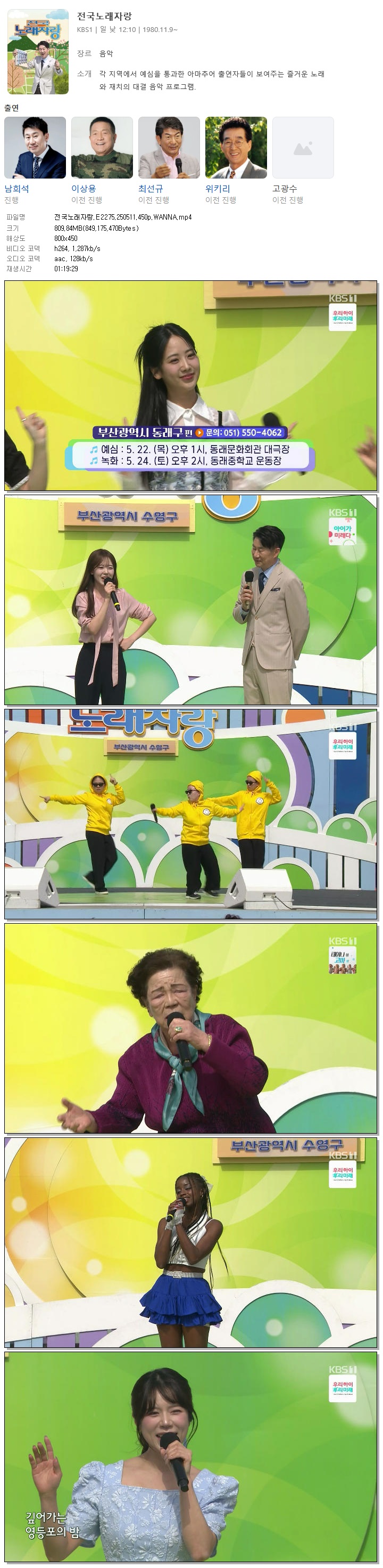 | [KBS1] 전국노래자랑.E2275.250511.450p.WANNA[남희석].mp4 | 809.8 M | 01:19:29 | 800x450 |