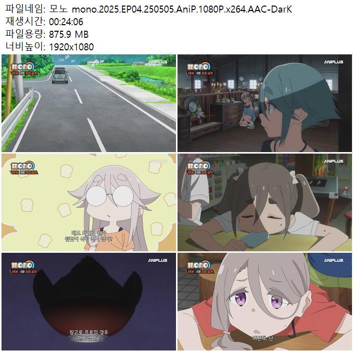 | 모노 mono.2025.EP04.250505.AniP.1080P.x264.AAC-DarK.mp4 | 875.9 M | 00:24:06 | 1920x1080 |