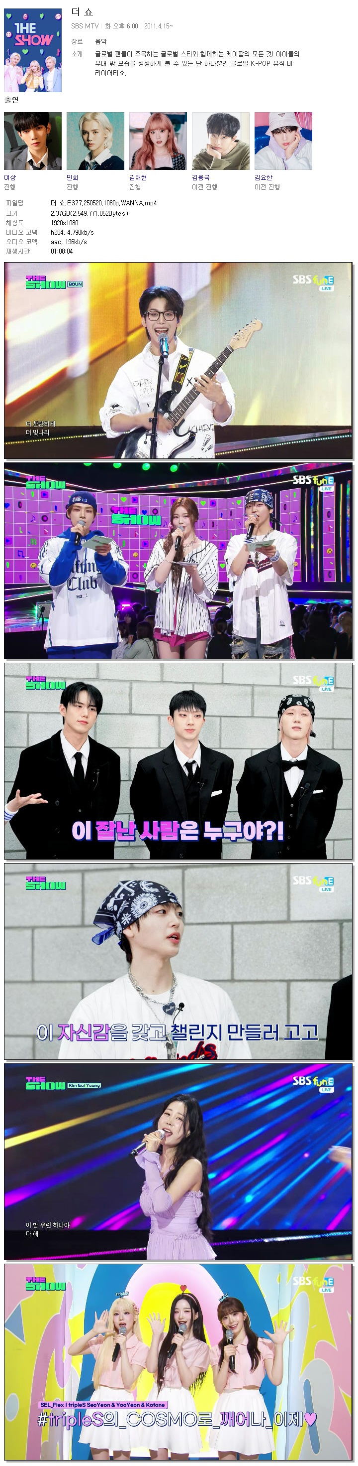 | [SBS FunE] 더 쇼.E377.250520.1080p.WANNA[서이브, 사무엘].mp4 | 2.4 G | 01:08:04 | 1920x1080 |