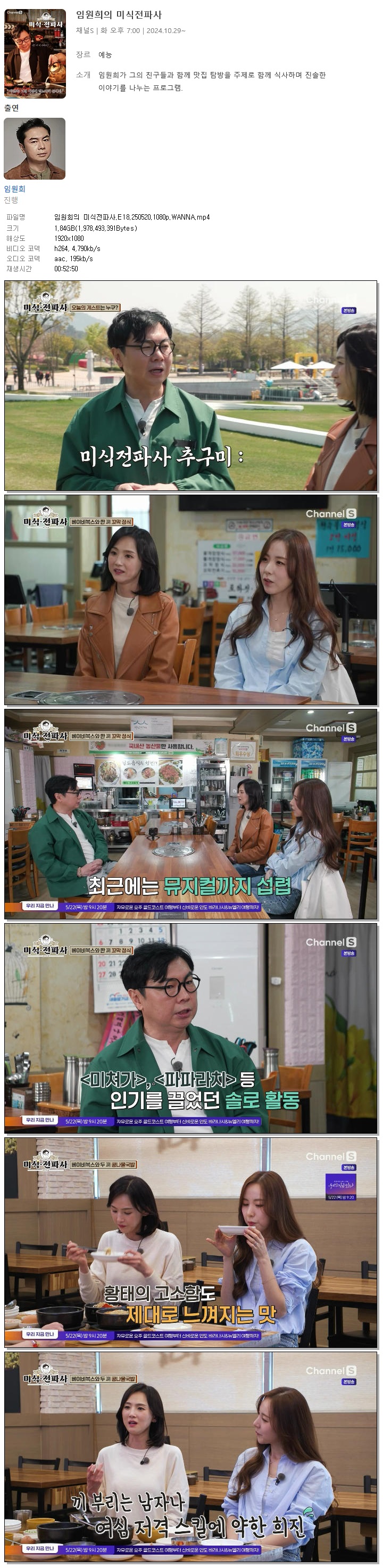 | [채널S] 임원희의 미식전파사.E18.250520.1080p.WANNA[이희진, 간미연].mp4 | 1.8 G | 00:52:50 | 1920x1080 |