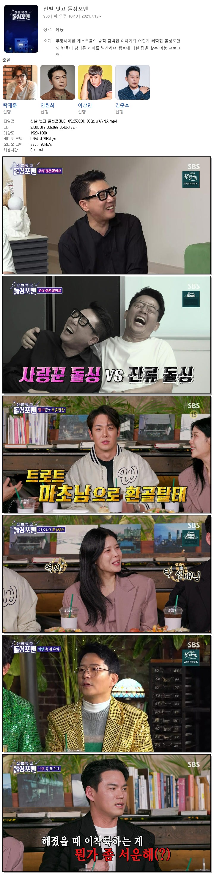 | [SBS] 신발 벗고 돌싱포맨.E185.250520.1080p.WANNA[환희, 린].mp4 | 2.5 G | 01:11:41 | 1920x1080 |
