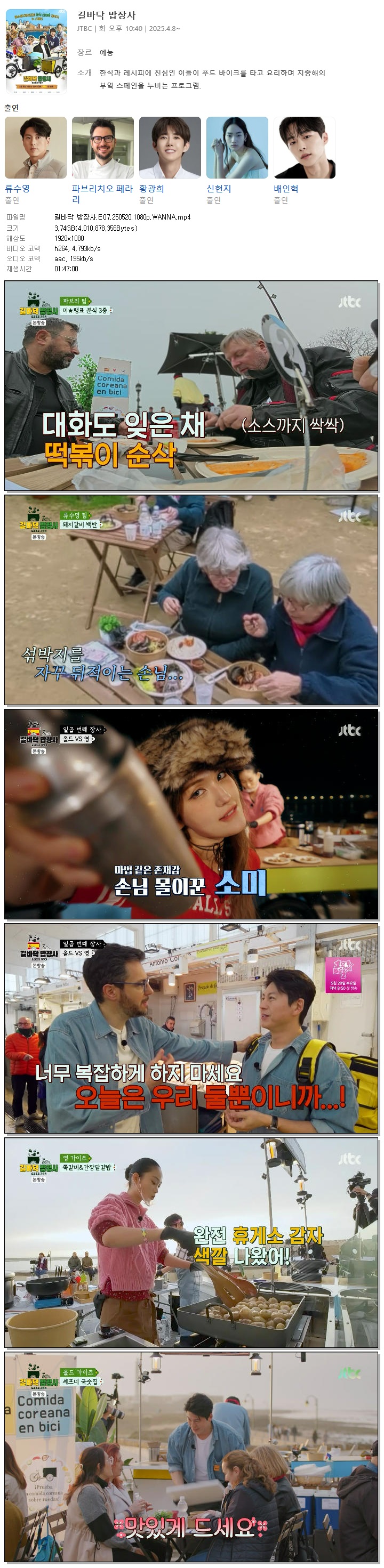 | [JTBC] 길바닥 밥장사.E07.250520.1080p.WANNA[배인혁, 파브리].mp4 | 3.7 G | 01:47:00 | 1920x1080 |