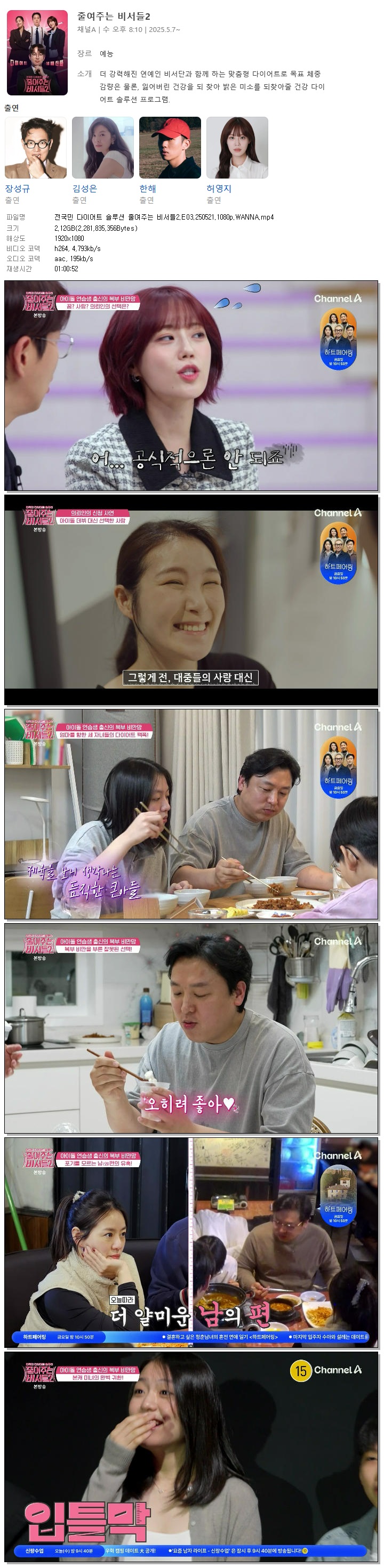 | [채널A] 전국민 다이어트 솔루션 줄여주는 비서들2.E03.250521.1080p.WANNA[장성규, 김성은].mp4 | 2.1 G | 01:00:52 | 1920x1080 |
