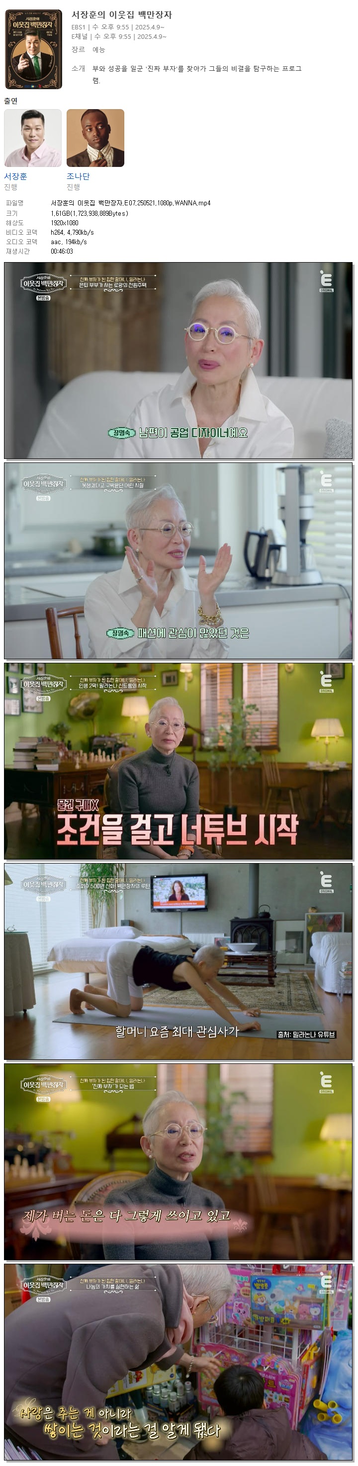 | [E채널] 서장훈의 이웃집 백만장자.E07.250521.1080p.WANNA[서장훈, 조나단].mp4 | 1.6 G | 00:46:03 | 1920x1080 |