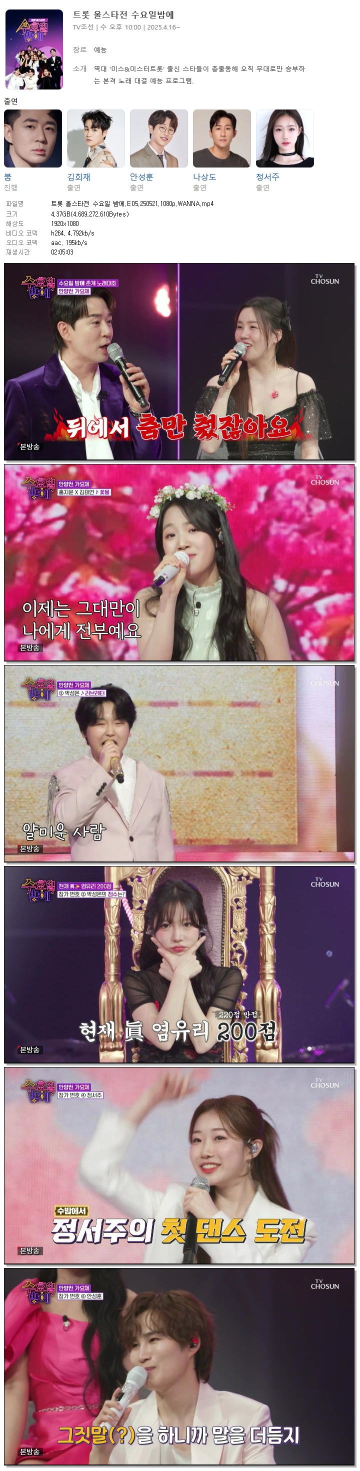 [TV조선] 트롯 올스타전 수요일 밤에.E05.250521.1080p.WANNA[안성훈, 배아현].mp4 4.4 G 02:05:03 1920x1080