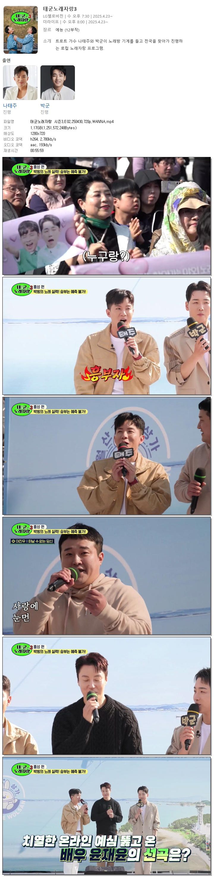 | [기타케이블] 태군노래자랑 시즌3.E02.250430.720p.WANNA[나태주, 박군].mp4 | 1.2 G | 00:55:59 | 1280x720 |