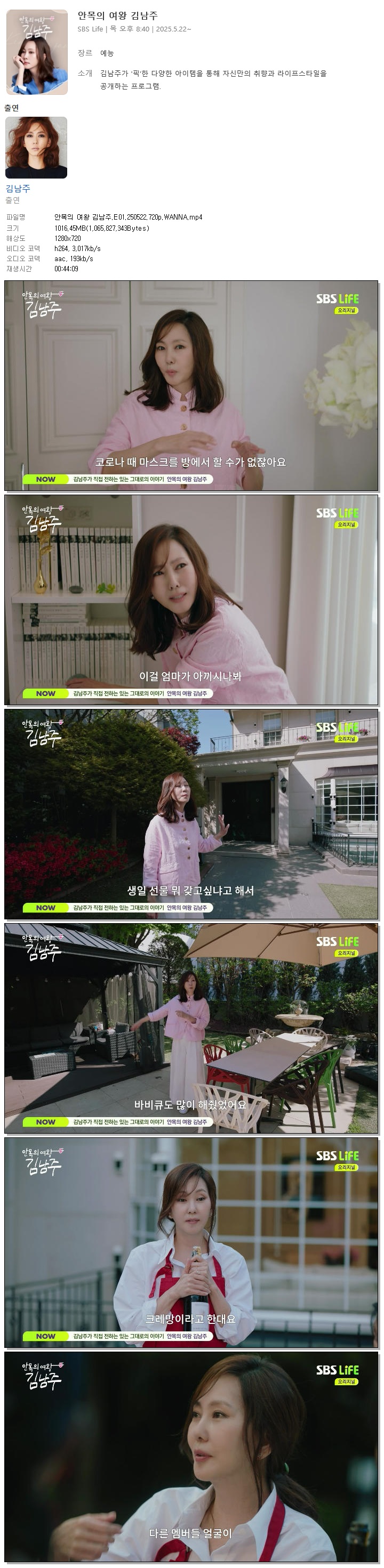 | [SBS LIFE] 안목의 여왕 김남주.E01.250522.720p.WANNA[김남주].mp4 | 1016.5 M | 00:44:09 | 1280x720 |
