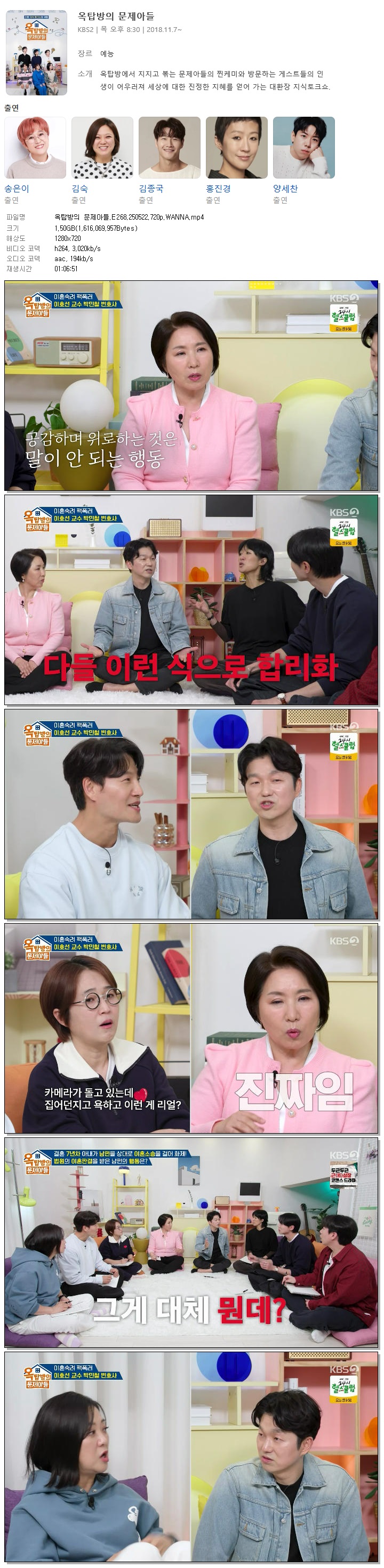 | [KBS2] 옥탑방의 문제아들.E268.250522.720p.WANNA[박민철, 이호선].mp4 | 1.5 G | 01:06:51 | 1280x720 |