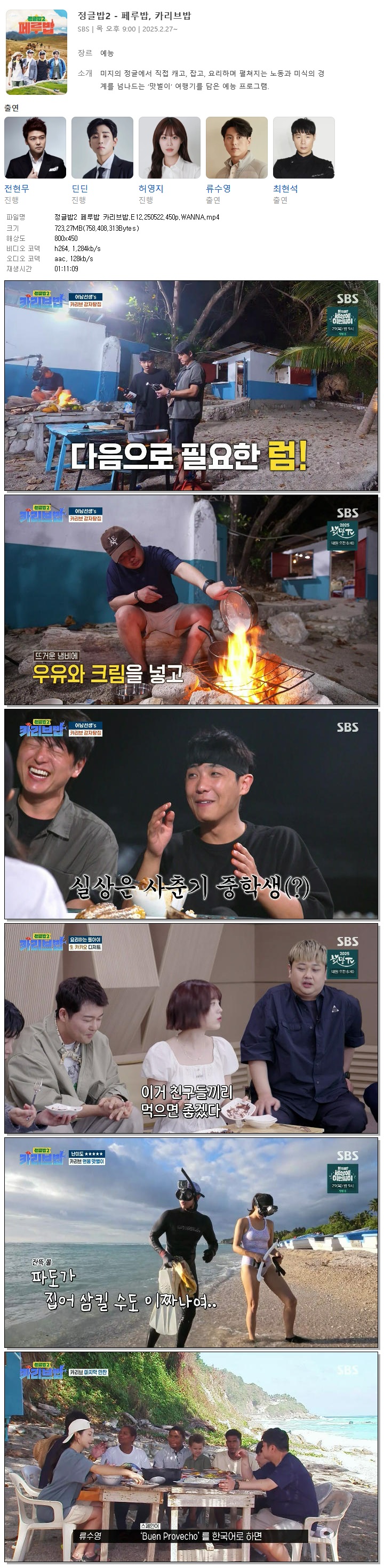 | [SBS] 정글밥2 페루밥 카리브밥.E12.250522.450p.WANNA[이준, 윤남노].mp4 | 723.3 M | 01:11:09 | 800x450 |