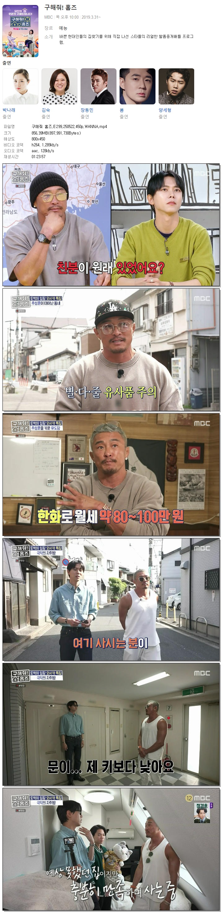| [MBC] 구해줘 홈즈.E299.250522.450p.WANNA[주우재, 추성훈].mp4 | 856.4 M | 01:23:57 | 800x450 |